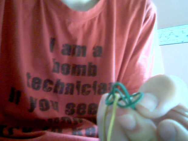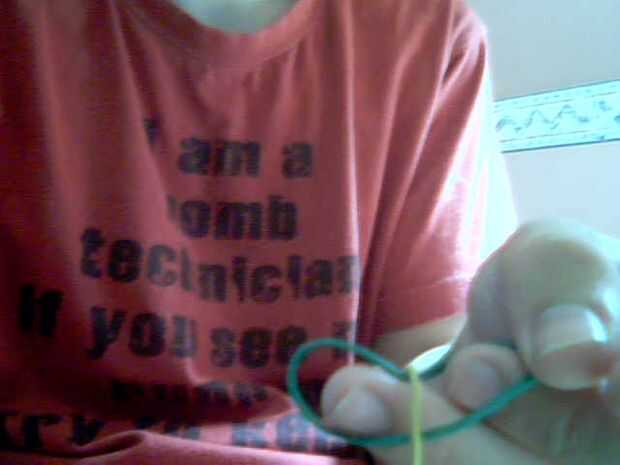 Si está utilizando pequeños elásticos, tienes que encadenarlos como en la foto. He doblado la hebra larga en 4tas y poner los extremos por los agujeros, usando los palillos pequeños para mantenerlos.