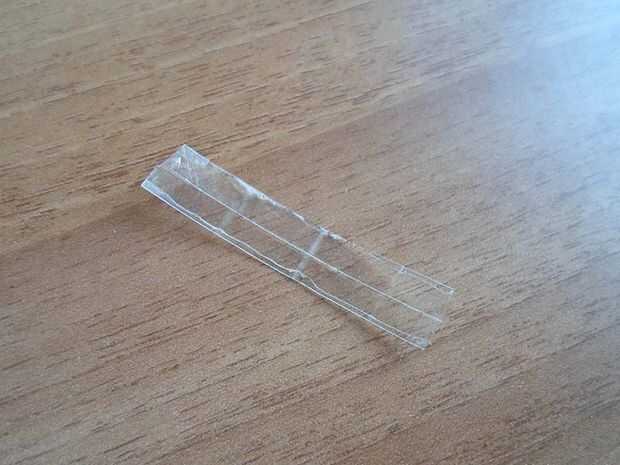 Doblar los bordes largo 2 para unirse sobre el lado pegajoso, en medio de la cinta y presione con los dedos.