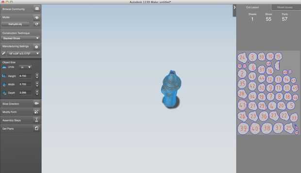 Este hidrante está apilado. Especificar cuántas hojas se van a utilizar en cualquier dirección. Las piezas rojas sobre la señal de modelo que algo no funciona. En este caso, las piezas no encajaba en el tamaño del tablero de salida especificada. Pero un rápido cambio en la configuración y todo está bien otra vez.