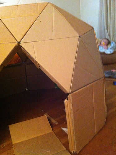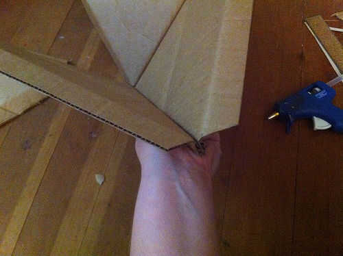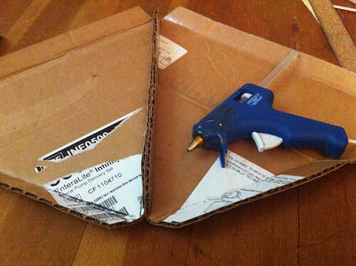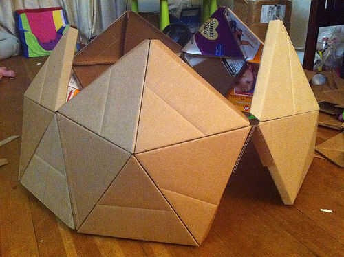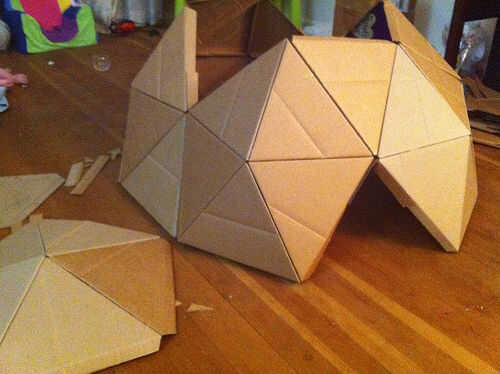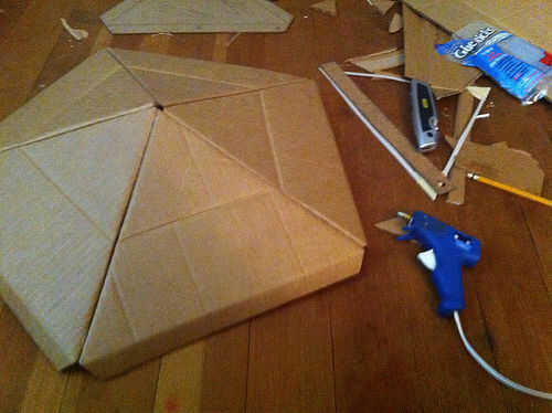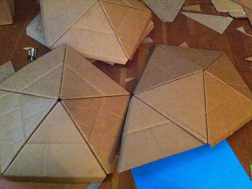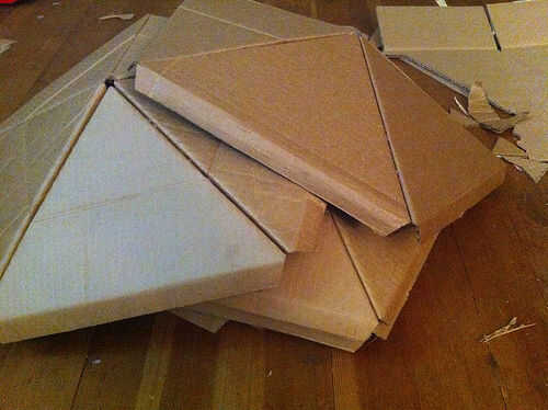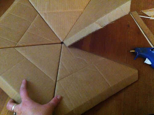 Si desea reforzar su estructura, corte extras triángulos y cuadrados para coincidir con los que tienes, pero sin las aletas esta vez. Pegue las formas sin las aletas a las formas con las aletas en el exterior (si las aletas se mantienen en el interior). Esto hará que una doble capa de cartón para la estructura, pero no una doble capa de las aletas. Esto funciona mejor si se mantiene el grano de la cartulina perpendicular; con una sola pieza con un grano vertical pegado a una pieza con una veta horizontal.