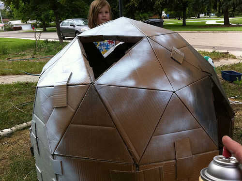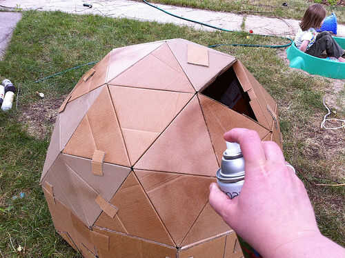 Generosamente cubierto el exterior de la cúpula con dos capas de imprimación transparente, dejar secar entre cada una. Pude haber lija en el cartón para eliminar esas pequeñas fibras que sobresalen, pero esto era para los niños, que no son críticos (ya que no hablan) y estaba presionado por el tiempo.