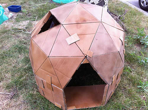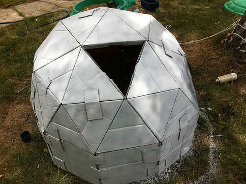 Había considerado suavizar las esquinas y tiras cubriendo esta cosa en papel maché, lijado y lo que es una casa de hobbit lindo o algo con un techo de paja o hierba verde... pero mi amigo dijeron que le gustaba el aspecto de las tiras y Josh dijo que tomaría demasiado largo y seco , y entonces pensé que podría hacerla parecer algo nave espacial basura y use las tiras de refuerza como un elemento de diseño.