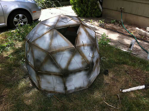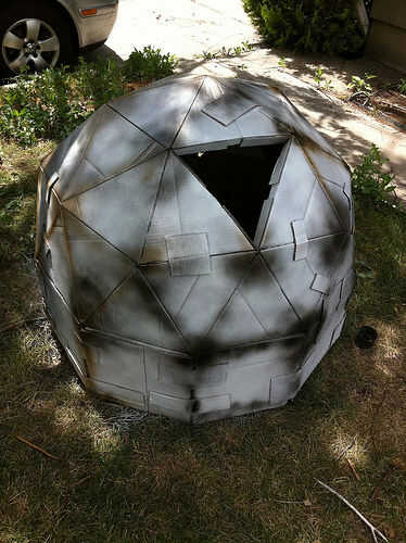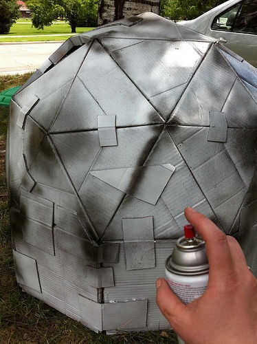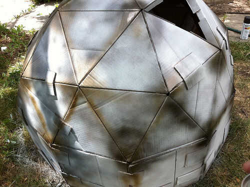 Había pintado pequeños círculos sobre todos los rincones de la bóveda, luego rociar una línea a lo largo de los bordes de los triángulos y cuadrados donde estaban las costuras. Ignoraba la cartulina poco tiras de refuerzo para esto, sabiendo que le pinta sobre ellos con algo diferente después. Una vez corrí fuera de la pintura de aerosol metálica gris más oscuro, cambiaron a la pintura de aerosol metálica bronze-ish y continuó. Yo no estaba preocupado por los dos colores mirando divertido; Sabía que después he añadido todos los efectos lo planeado, se vería muy bien.