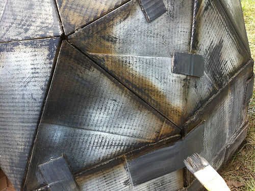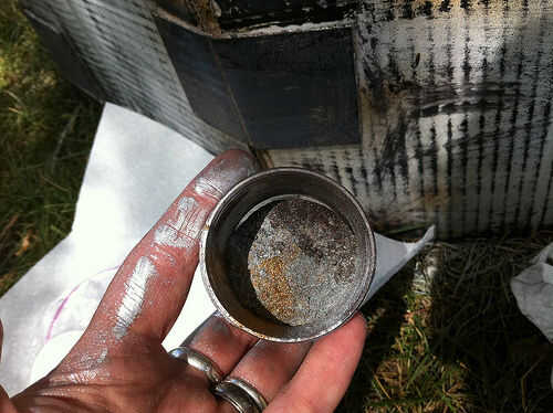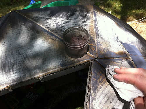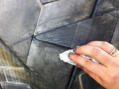 Tenía algún polvo de metal en tres colores: bronce estatuario (realmente oscuro), bronce y plata. Mezcla un poco de plata y bronce con el bronce estatuario para hacer un color metálico plateado oscuro, entonces tomé una toalla de papel y frota el polvo fino por toda la cúpula. No respirar este material en y lávese las manos después de usarlo; se aferra a todo y hay algunos metales que probablemente no desea mantener en su cuerpo. No vaya demasiado pesado con el polvo o a cubrir su trabajo de pintura hermosa.