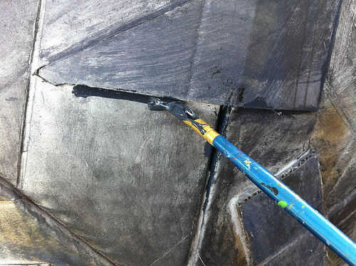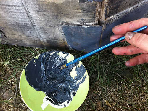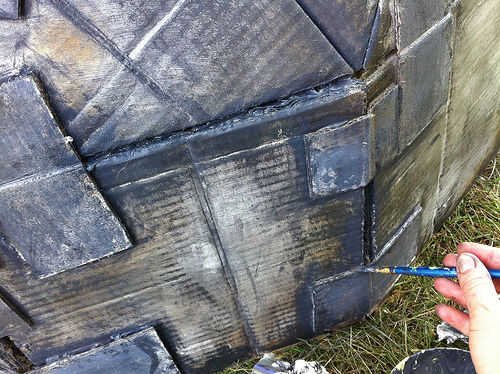 Después de esto, miré en los bordes, especialmente alrededor de la cartulina en tiras de refuerzo. El pincel grande no puede conseguir con ellos muy bien. Tomé un pincel pequeño esta vez y utiliza pintura gris oscurezca acuosa. Esto permitió que la pintura fluya en las pequeñas grietas, etc.. He pintado alrededor de los bordes y las tiras de refuerza, limpiando el exceso con una toalla de papel seca. Esto dejó la pintura en las grietas, lo que es mirar un poco más oscura y realista (al menos en mi mente).