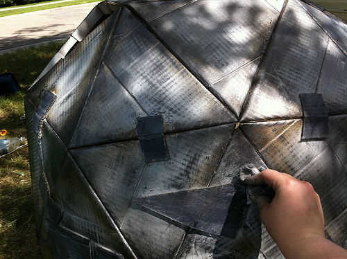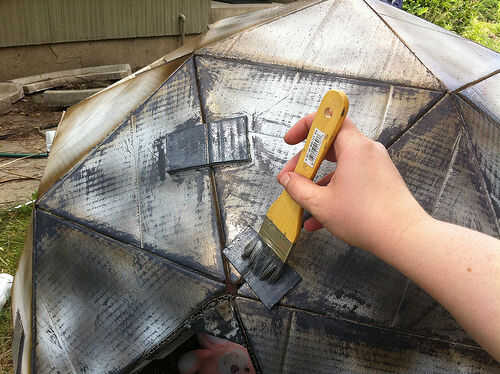 Después de que la cúpula parecía suficiente metálica para mi gusto sin cubrir encima de la pintura, rocía lo muy a fondo con una capa superior clara para sellar en el polvo. También usé un pincel en capa transparente para asegurarse de que el polvo no frota apagado. Como dije en el paso anterior... esto hubiera sido más fácil si hubiera tenido alguna pintura en aerosol plata para cubrir el blanco antes de usar el metallics oscuros a lo largo de las esquinas y bordes. Pude has saltado el polvo completamente, y creo que se vería casi exactamente lo mismo.