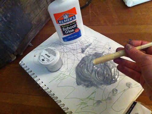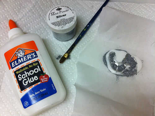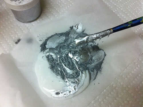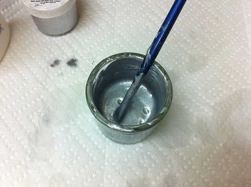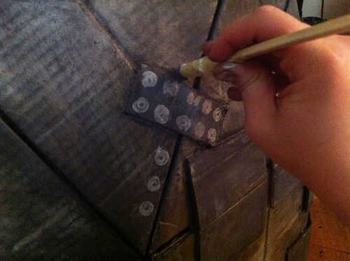 Sumerja el pincel en la pintura de plata, limpie el exceso y presiona sobre la cartulina cerca de una costura. Girar el cepillo un poco para asegurarse de que conseguirán rellenar cualquier abolladuras en el cepillo del círculo. Girar el cepillo un poco asegurará un buen círculo. Repita siempre que crees que debería ser un remache.