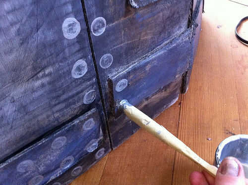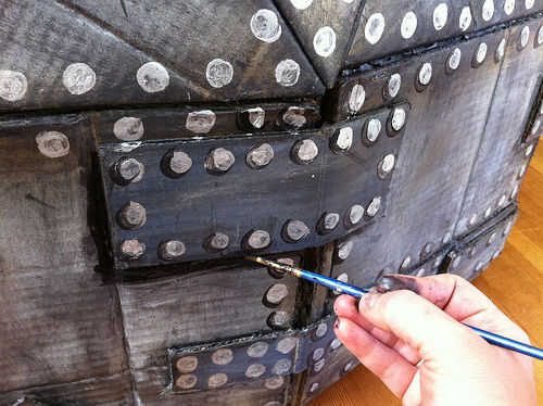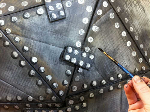 Mezclar algunas ligeramente negra u oscura gris acrílico pintura acuosa. Con un pincel pequeño, pintar rápidamente una forma de C en el borde de los remaches, superposición de la C en el remache un poco. En mi estructura, pinté todas las formas de C en la parte inferior izquierda de los remaches.