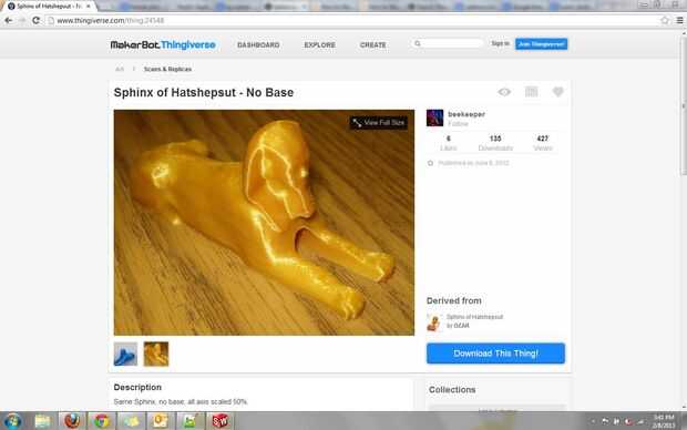 Esta esfinge de Hatshepsut fue modelada por el apicultor en Thingiverse. Curiosamente, este modelo fue creado utilizando otro producto 123D Catch 123D. El modeler tomó en algún lugar entre treinta y setenta fotos de la esfinge de granito de 15.000 libras en el Metropolitan Museum of Art en Nueva York y utiliza el software para unir las fotos en un modelo tridimensional.