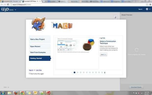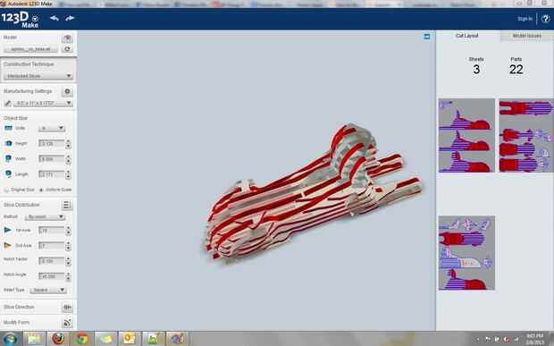 3. ejecutar Make 123D en cualquier versión que mejor adapte a sus necesidades y recursos. Opté por usar la aplicación web, porque esta aplicación en particular es 'luz' y quería rodajas de cartón apiladas. Google Chrome es el navegador recomendado para la aplicación web, pero puede utilizar Firefox o Internet Explorer con la configuración y plugins adecuados (las instrucciones se proporcionan automáticamente si intenta acceder a la aplicación web mediante uno de estos navegadores). Para modelos más detallados o más grandes, sugiero la aplicación de escritorio. La aplicación de escritorio permite seleccionar entre más técnicas de construcción, tales como rebanadas que se enclavija, radial o curvados (ver la imagen final en este paso).