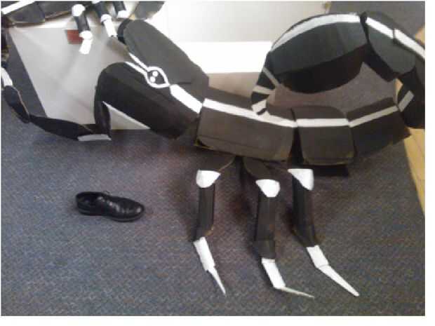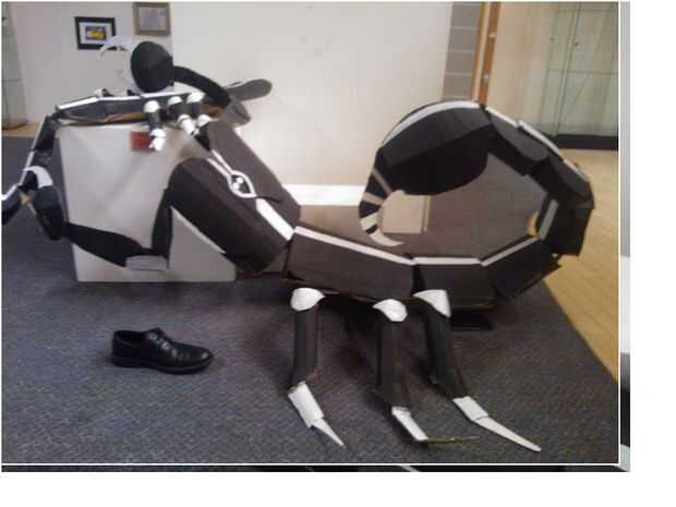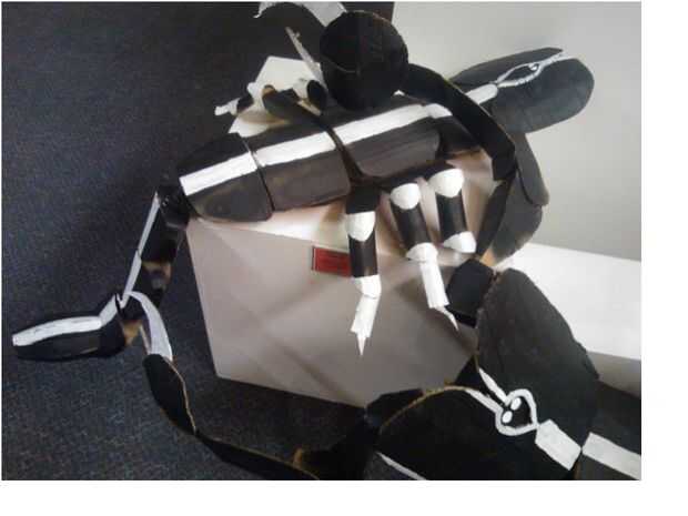 Mi escultura de escorpión fue inspirado por una reciente visita a un museo local que se exhibe una gran selección de anamatronic animales, incluyendo insectos. Decidí que en lugar de construir un modelo de anamatronic me hacen una reconstrucción del escorpión de cartón pero le dan una chispa personal haciendo dos escorpiones en vez de uno y ponerlos en una posición de combate muy dinámica que permite al espectador imaginar el movimiento de los animales. Yo también había pintado con franjas de carreras anormal por lo que puede transmitir aún más una sensación de movimiento.