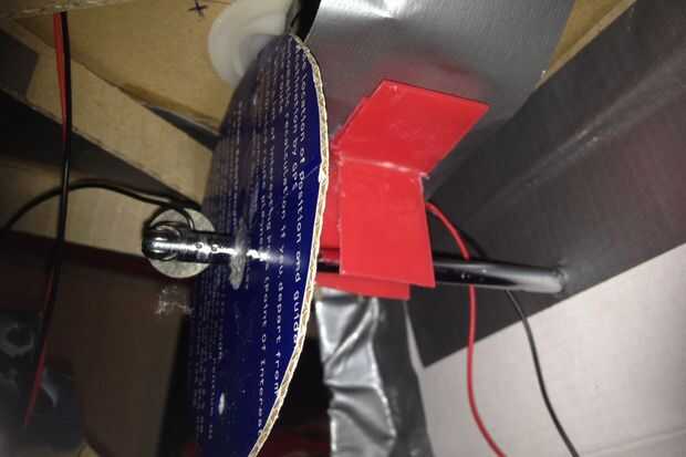 7.) para hacer la sección de cola, conecte el motor a la el interior medio cuerpo superior del panel de la cerca de 5 cm de la parte trasera, motor rueda hacia la parte delantera del cuerpo. El motor de la rueda tiene una sección levantada que devuelve al centro de cada rotación, actuando como una palanca. Conecte el motor utilizando agarra pegamento adhesivo o super. Cortar un disco de tamaño CD de una paz de cartón grueso, hacer un pequeño agujero en el centro y meter la antena telescópica a través para que encaje bien en la parte más gruesa de la antena de unos 5cm del extremo.