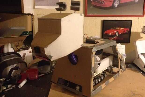 4.) ahora colocar el chasis del tanque sobre la superficie de trabajo. Extraiga las pistas de goma y taladro 2 agujeros de cada lado, sólo en desde cada esquina en el alero de chasis que cubre la parte superior de las pistas de las ruedas. Pone el cuerpo sobre el chasis del tanque, asegurándose de que la parte delantera del cuerpo y la parte delantera del tanque se enfrentan a la misma dirección. Nota: El tanque tiene que conectarse como frente lejos como sea posible al cuerpo para no inclinar hacia adelante debido a la ubicación y el peso de la cabeza. Marque los orificios del chasis de tanque sobre los rieles, perforar y juntos, con los pernos a través de la rueda de la base y hasta en el riel. Asegúrese de que el cuerpo ahora se sienta sobre el trabajo superficial a un nivel 2cm alrededor entonces de volver a montar el depósito de goma pistas.