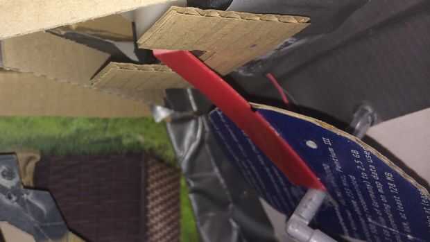 8.) pegar una tira de 6 cm delgada de plástico (de la caja de la cinta de video utilizada anteriormente) en el disco para que cuelgue de 3 cm sobre el borde. Ahora corte una paz cuadrada de cartón del mismo tamaño que la caja del motor y cortar una pequeña sección sólo un poco más ancha que la tira de plástico unida al disco de cartón. Pegar el cartón cuadrado para el motor de la vivienda por lo que la corte se cierne sobre el motor de la rueda. Ahora corte 2 "L" soportes de la caja vídeo y pegamento a la parte posterior de la Plaza de cartón dejando una separación de 1cm entre ambos lados del soporte.