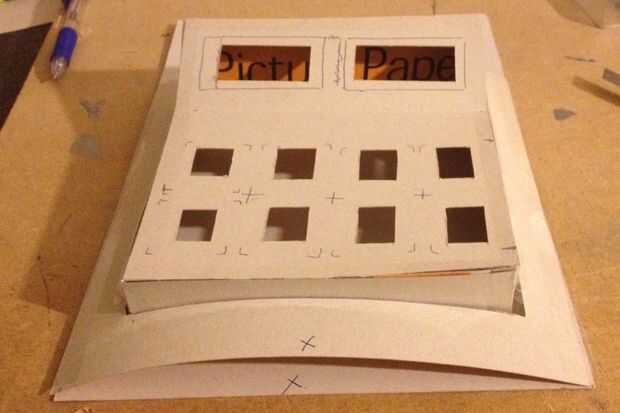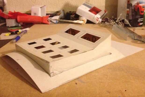 2.) para hacer el panel de botones, cortar dos tiras de cartón delgado 15x4cm de medición. Luego cortar dos tiras, 15cm, 10 cm hacerlas 4cm de profundidad, y al final de los últimos 5cm ir hasta 6cm de profundidad. Conecte los 4 lados juntos utilizando pegamento y algunos cartón fijación pestañas, manteniendo los lados planos opuestos y los 2 lados angulados uno frente a otro. Ahora cortar 5 tiras de 19x2cm, doblar los extremos para hacer 2cm las lengüetas de fijación. Pegar en el marco de botones en cada extremo, en la sección angular y otro en 7cm de la sección plana mayor.