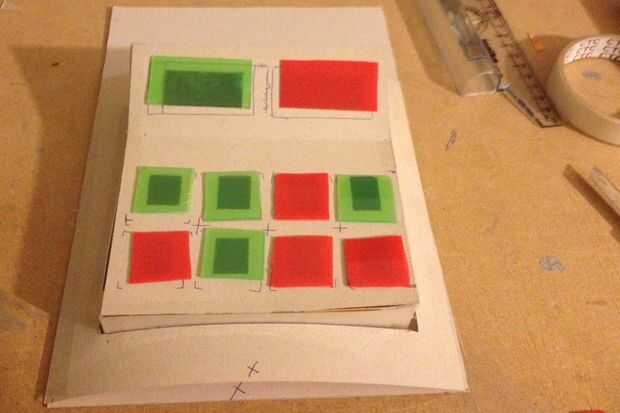 3.) para la sección de botón, cortó una hoja más de fino cartón 15 x 15.5 cm luego hacer un bend en 10 cm el largo 15,5 cm. En la sección plana de corte ocho plazas los 2x2cm. En la sección doblada 5 x 15 cortar dos rectángulos de 4x2cm. Ahora aplique el pegamento en las tiras de fijación y acople el los botones de la cubierta a la estructura.
