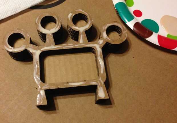 Pegar las piezas fue sorprendentemente lento. Comencé por pegar las dos piezas de la espalda. Aplique una capa delgada de pegamento en toda la superficie de acoplamiento y junte las piezas. Mantenga pegado y añadiendo pedazos hasta su pila es altura suficiente para mantener el cuerpo entero del marcador. Si prefieres ver más de la pistola que sobresale del titular, puede hacer la pila más corta. Tenga cuidado de no dejar cola cieno en los recortes de interior ya bloqueará los marcadores de conexión. Limpie cualquier goteo derecha a medida que agrega cada capa.