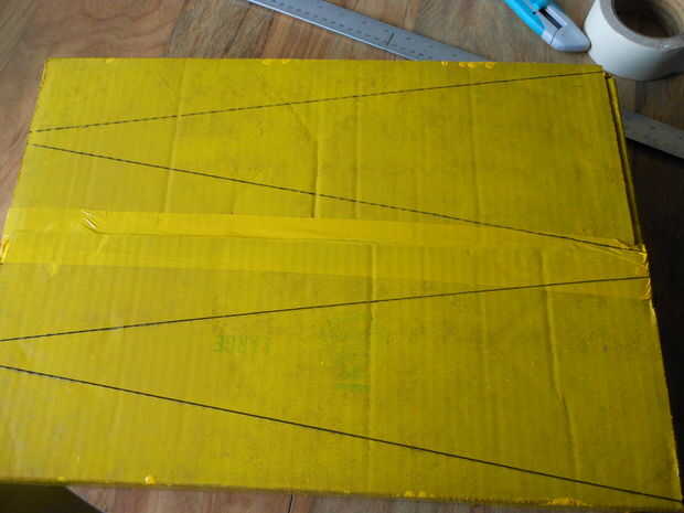 Suba la parte inferior de la caja.  Quieres tener una idea de donde las líneas inclinadas de las rampas para recorrer.  Mide 1 pulgada (2,5 cm) hacia abajo desde la parte superior y 6 pulgadas (15cm) abajo de eso y repite el proceso hasta que tuve las marcas para el comienzo y el final con sesgos en los dos extremos.  Siguiente trazar las líneas que las inclinaciones de 4 rampas.  No termino siguiendo estas líneas exactamente, pero lo suficientemente cerca.