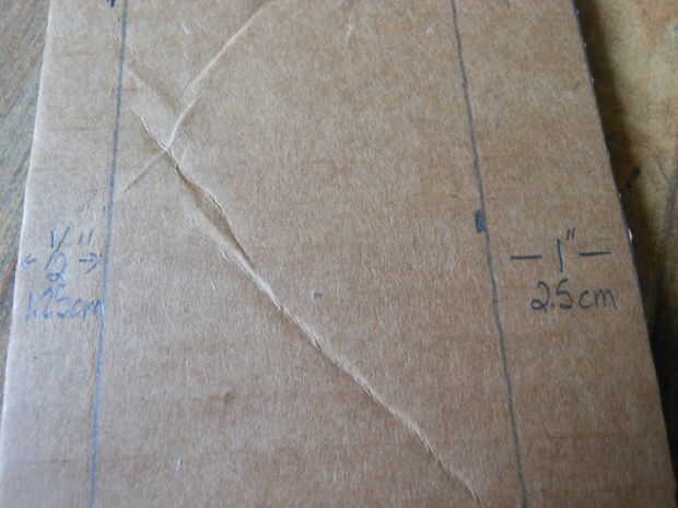 En una de las tiras largas, medir y dibujar una línea 1/2 pulgada (1,25 cm) largo a la izquierda largo lateral y dibujar y medir una línea de 1 pulgada (2,5 cm) de ancho en el lado derecho.