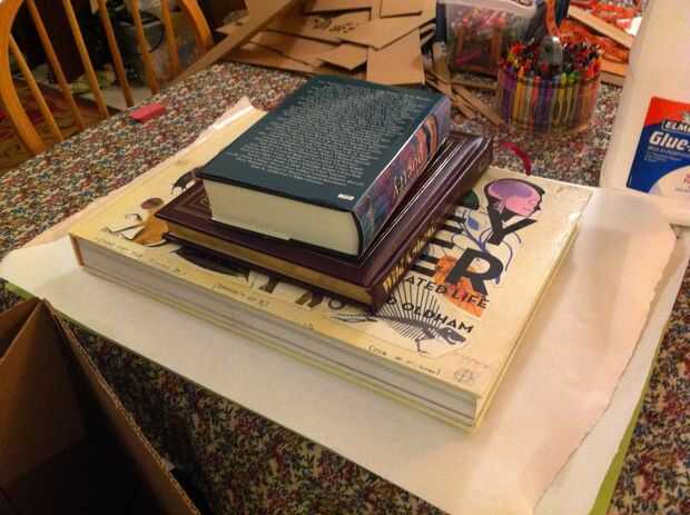 Ahora uso todo el cartón sobrante para crear una tapa para el cubo. Los desechos son grabados, cortados a la medida, pegados y cargados con papel de congelador y libros grandes. La tapa se corta a aproximadamente 16 1/2 pulgada cuadrada con 5 capas de cartón. El labio de la tapa fue hecho con 2 pulgadas de tiras de cartulina de 16 1/2 pulgada que se caliente pegado al borde con un par de pequeñas tiras para reforzar las esquinas.
