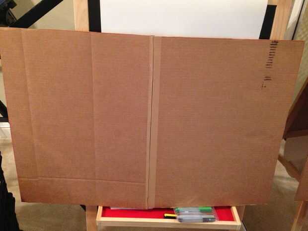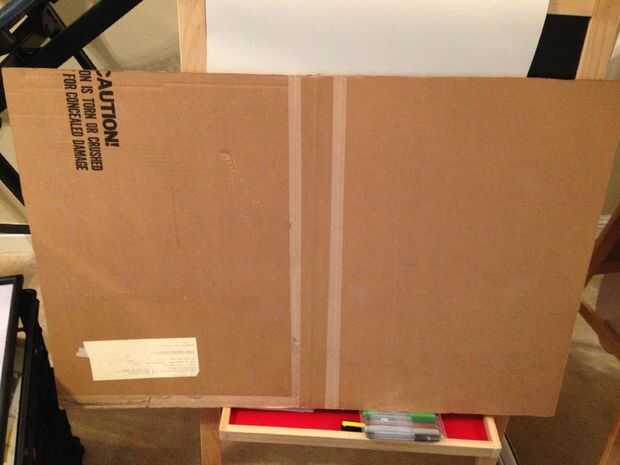 Corte dos trozos de cartón de una caja vieja de tamaño 18 "x 24". Colocarlas lado a lado, a lo largo de la longitud de 24". Con cualquier cinta de embalaje (me gusta "Caja / embalaje cinta de papel" de Uhaul http://www.uhaul.com/MovingSupplies/Tape/Box-Packaging-Paper-Tape-%2855-yard-roll%29?mid=143&id=822-es fuerte y pegajoso y se puede rasgar con la mano, y mezcla bien con el color de la cartulina), los dos lados a lo largo de la costura de la cinta y lisa con una regla o algo para asegurarse de que se adhiere bien.