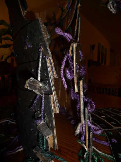 Usé 6 cordones a través de un patrón formado después de estudiar muchos otros cordones. Armadura tradicional como la hice utiliza un patrón de colgante, pero cartón no es resistente por lo que me aseguré de que todo estaba atado firmemente en todas partes. Menos movimiento = menos posibilidades de romperse. Para distancia, encontré ese triple la distancia necesaria para ser atado es una buena medida.