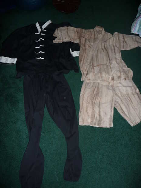 Usé un viejo traje de kung-fu para la primera capa (negra con blanco manga) y, a continuación, un Zinbei para la capa superior (marrón). Un Zimbei es un pijama Japon tradicional para los hombres. Yo tengo la mía hace años como un regalo de un japonés antiguo amigo de la familia, pero usted puede recoger uno en cualquier supermercado Japon generalmente. Para el cinturón (Obi), usé el negro kung fu faja. Sólo había atascado mi espada en a través y llevó a cabo la mayoría de la noche. Para mis manos sólo utilicé viejos guantes de la motocicleta.