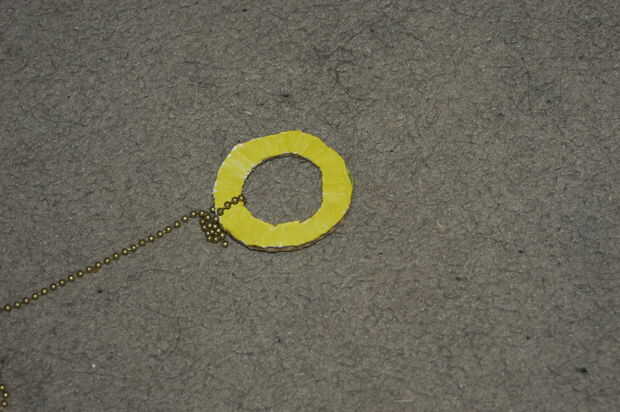 La cadena el monóculo, sólo cinta aislante o pegamento caliente a la parte posterior del monóculo.  Que llevar el monóculo, coloque un par de trozos de cinta de doble cara en la parte posterior de la misma y poner sobre su ojo.