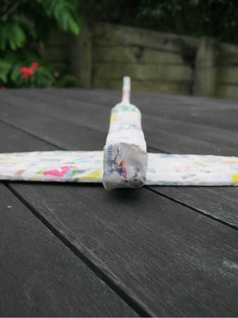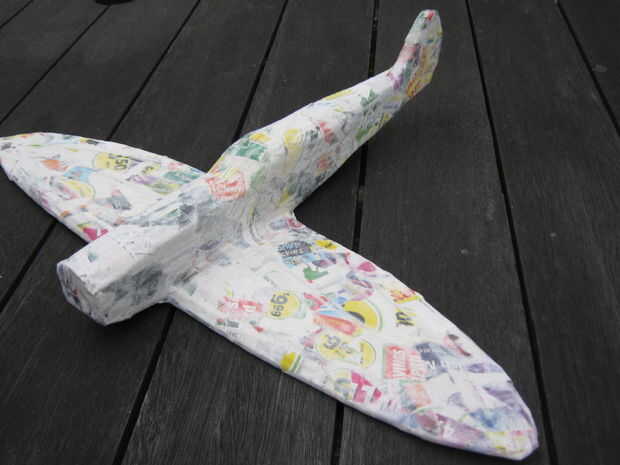 Decidí que quería un acabado más liso en el avión que permitió el cartón apilado, así que cubrí con papel maché. Hay montones de tutoriales para esto en línea, así que no te digo cómo hacerlo aquí, pero recomiendo cubriéndolo en secciones, y dejarlos secar antes de pasar a la siguiente sección por ejemplo, hacen las alas en primer lugar, deje que se seque, luego se mueven en la mitad delantera del fuselaje, deje que se seque, luego hacen la parte de atrás la mitad del fuselaje. Esto le dará el tiempo de humedad para escapar, que significa que la cartulina por debajo no empapada, y el modelo de no perder su forma.