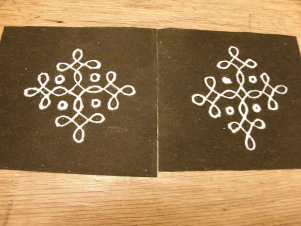 yo papel de brillo de zapato de color negro con el color de la tela y utilizando perla 3D trazador de líneas blanco, dibujó un kolam o rangoli (otro tradicional indio arte popular) que coloca a ambos lados de las escaleras.