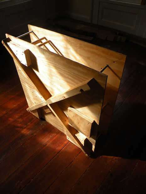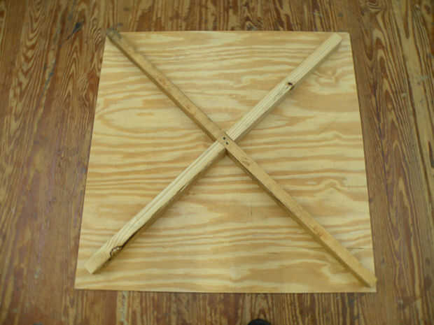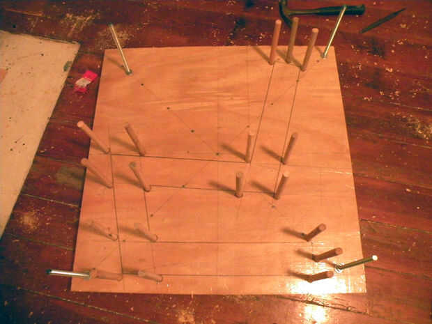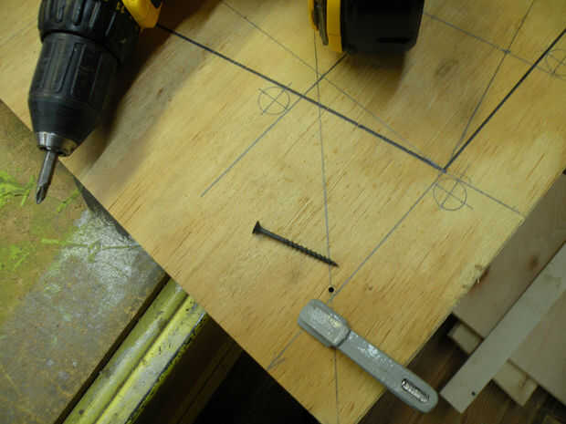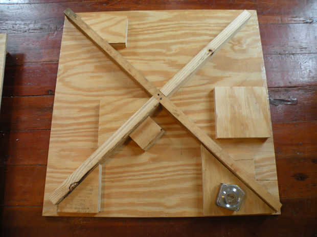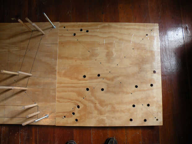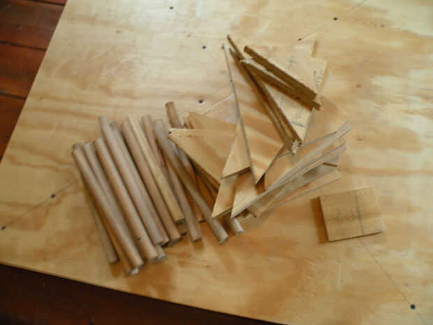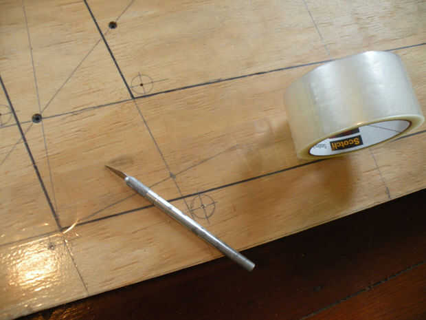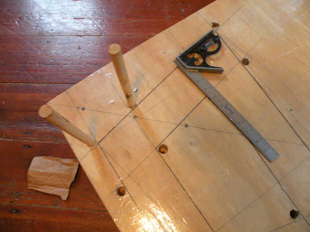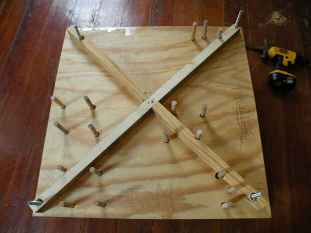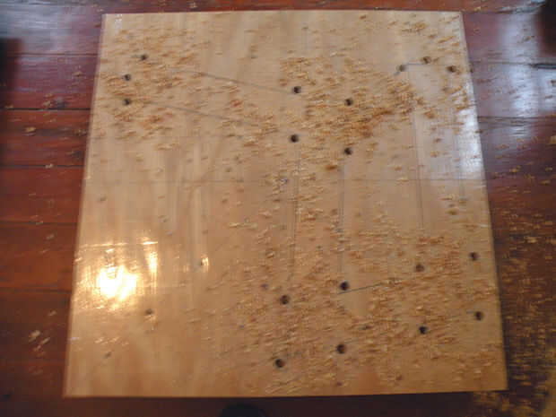 A continuación, dibuje un círculo para una clavija en cada intersección de la silla. Cinta sobre la madera de embalaje cinta para sellar de pegamento derramado; usted podría también barniz lo, pero la cinta es más rápido y más barato. Perfore las marcas realizadas para las clavijas, que registrarán el cartón en la alineación. Hice mía de hickory clavijas donadas por mi dueña; puede usar taquetes, pernos, tubos. Puesto que mi madera contrachapada era tan delgada, tuve que añadir poco desechos a la parte trasera de la pieza inferior de la plantilla como se muestra para las clavijas se sentó abajo en algo. Si utiliza madera contrachapada gruesa, estas piezas podrían ser eliminadas. Es importante que las clavijas se seguro, porque se toman algunos abusos y que quieras ser exacta para capa tras capa. Me pega y atornilla en sus cuencas.