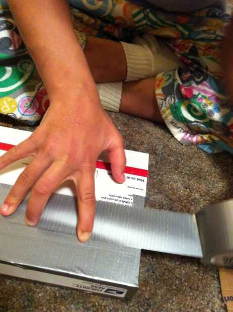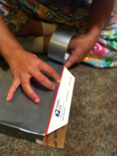 a partir de los bordes biselados, coloque con cuidado la cinta del conducto para 1/2" se cierne sobre el final. Comenzar a envolver la caja con cinta adhesiva, una fila a la vez. Cada fila debe cubrir aproximadamente una 1/2" de la fila anterior. Continúe hasta que la caja está completamente cubierta.