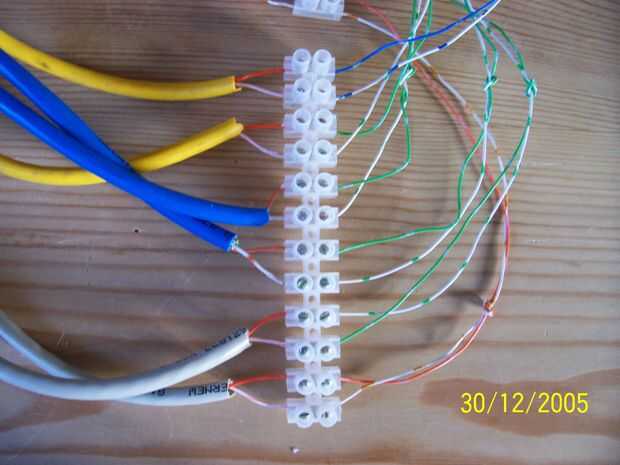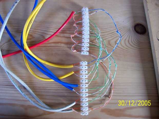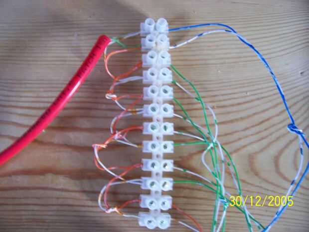 El segundo conector tiene las 6 salidas o nodos de zonas, puede cortar cada 1m de cable abajo y usar sólo el par blanco naranja, conecte al conector eléctrico con el fin de reflejar en el conector de entrada. foto muestra 2 x azul, 2 x amarillo, 2 x cables gris estos conectan a los puertos 1-6 en 3com hub.