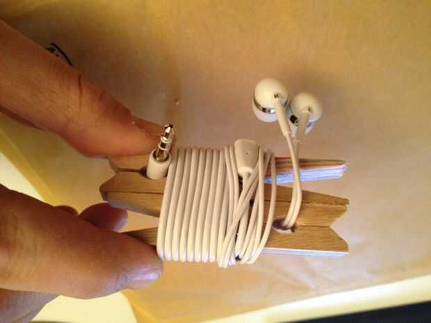 Sólo abra una de las 2 pinzas para la ropa y arreglo el audio jack en allí, a continuación, cierre. Tuerza el cable alrededor de su creación y luego solucionar el headhones abriendo la otra pinza. Todo hecho!