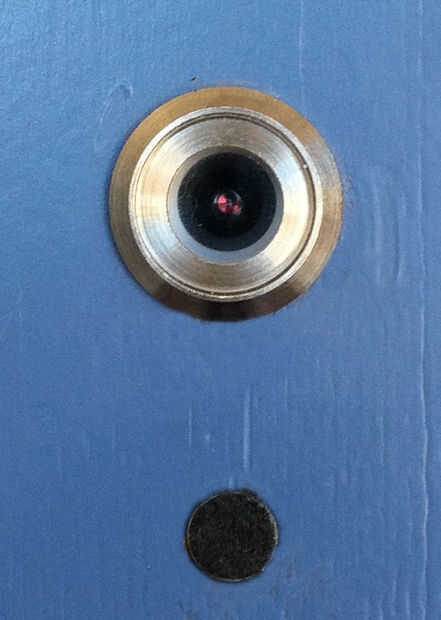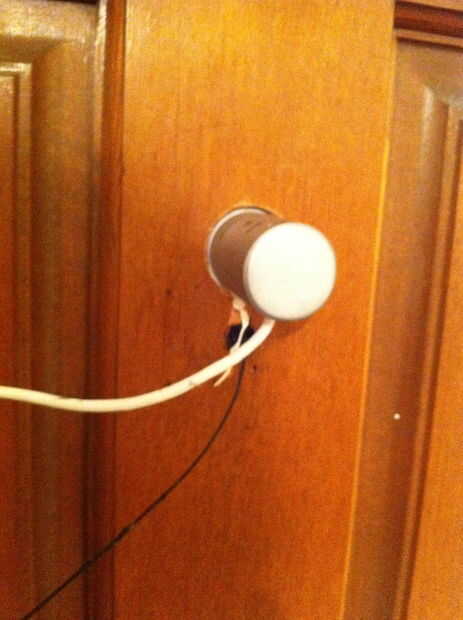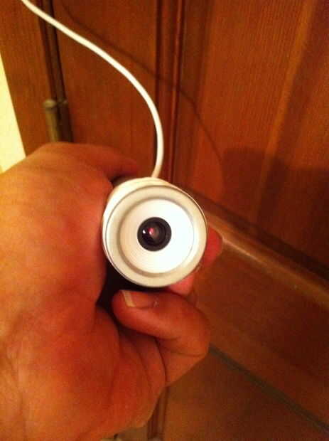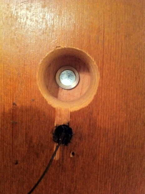 Para hacer este trabajo, que necesitaba para ocultar el hecho de que hay una cámara y un micrófono incorporado en la puerta, para taladrar un orificio de 1" en la puerta y dejó 1/4" desde el frente, golpeando la pieza. Luego, usando una herramienta dremel para lijadora había aplanado la madera por lo que hubo sólo la abertura tamaño mirilla en el exterior. Usando la antigua mirilla con la lente quitada, añadí una lente protectora de cristal y luego integrado la cámara detrás de él, dejando a este aspecto (ver foto) en el frente.