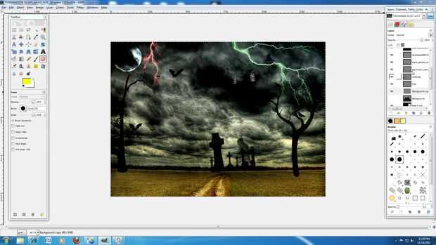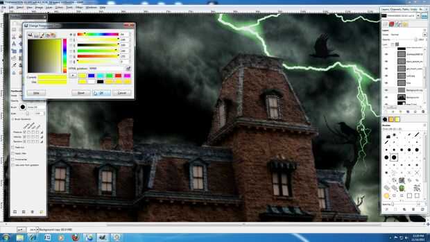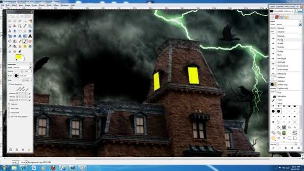 5: Cambiar el color de la brocha yendo: caja de herramientas GIMP > los dos cuadrados en la parte inferior (debe ser blanco y negro) > clic en delantero > seleccione amarillo. Color en las ventanas con el pincel. Otra vez se puede utilizar el pincel más grande como GIMP sólo te deja color en lo que se selecciona - que es el de windows.
