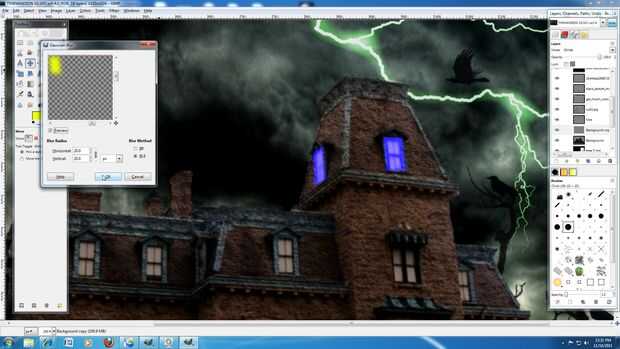 7: Ir a Desenfoque gaussiano y desenfoque de la nueva capa de la casa. Utilizar el radio de 20pixels. Esto un poco de mezcla en la luz y darle el efecto que se irradia fuera de la casa.