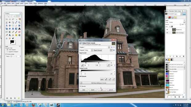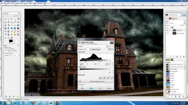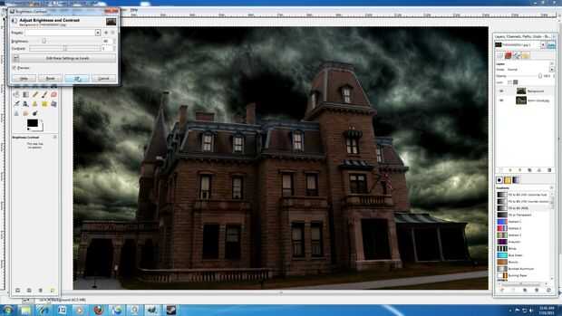 16: Localice el icono de brillo y contraste por ir: barra de herramientas GIMP > colores > brillo y contraste. Ahora seriamente disminuir el brillo de la capa de la casa.
