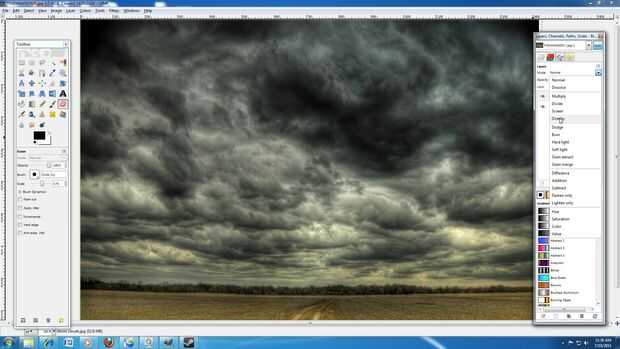 9: Seleccione un cielo tormentoso para reemplazar tu cielo anterior. Quieres uno con parece realmente asustadizo y que solo desea quedarse dentro. En la barra de herramientas GIMP vaya a archivo > abrir como capas > y seleccione la imagen.