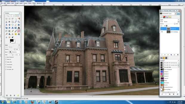 11: En las capas y la caja de herramientas de pincel, haga clic en retener la capa con el cielo tormentoso en él y arrástrelo a la parte inferior. Esto hace que la capa de la casa que en la parte superior el cielo tormentoso.