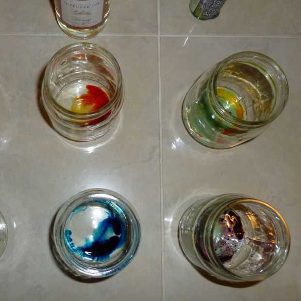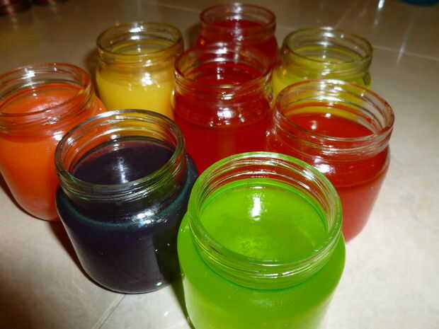 - Vierta unas gotas de colorante de tu elección en cada frasco.