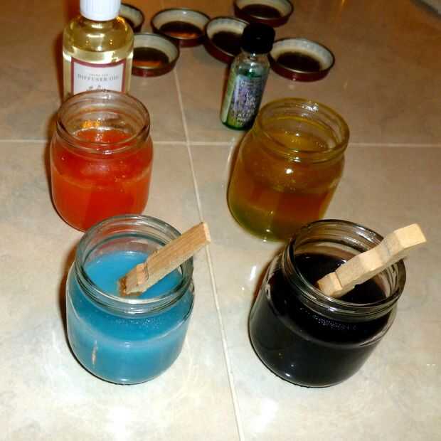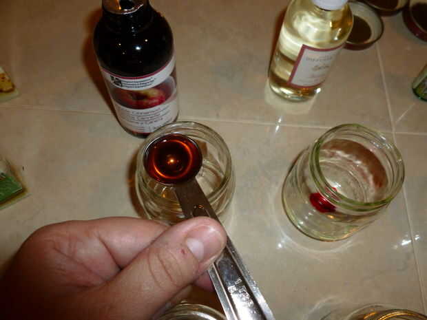 - A continuación, vierta una 1 cucharadita (mínimo) de aceite esencial en cada frasco. Puedes agregar más si desea un olor más fuerte que emana del resultado final. Yo no utilizó más de dos cucharaditas y fue satisfecho con el resultado de una cucharadita.