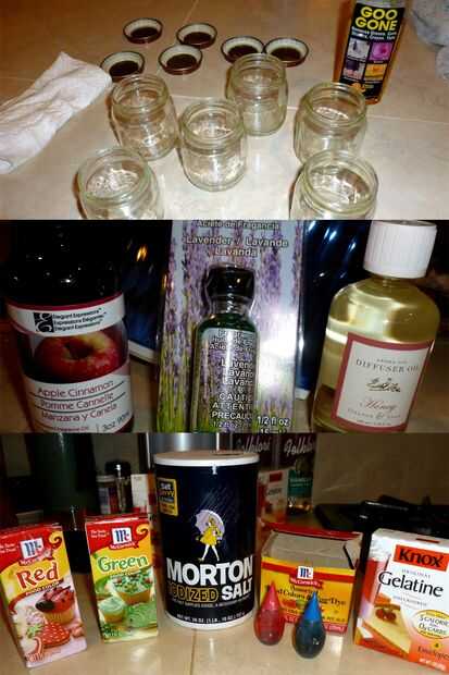 - Gotas aceite esencial o fragancia del sitio (puede comprarse en una tienda de artesanía, pero uno encuentra a la venta por $2 en Wal-mart.)