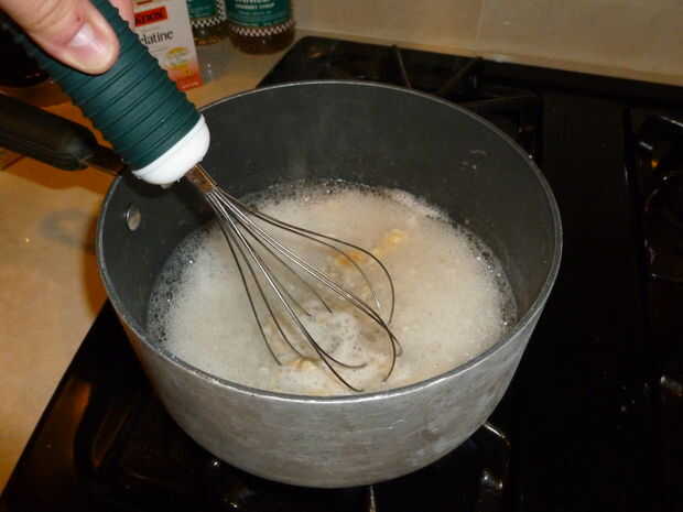 - Añadir todos los 4 cuatro sobres de gelatina en el agua hirviendo y batir hasta que se disuelva. (Calculo que disuelve en aproximadamente un minuto).