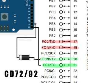 Con este método que necesita soldar dos cables al chip más grande (llamado 78C 17) en el panel y conectar a los pines de Arduino 0 y 1 - la conexión de la clavija 1 en el panel de alarma debe tener un diodo con el end(cathode) rayas del diodo va a Arduino - no rayas para el chip de alarma.
