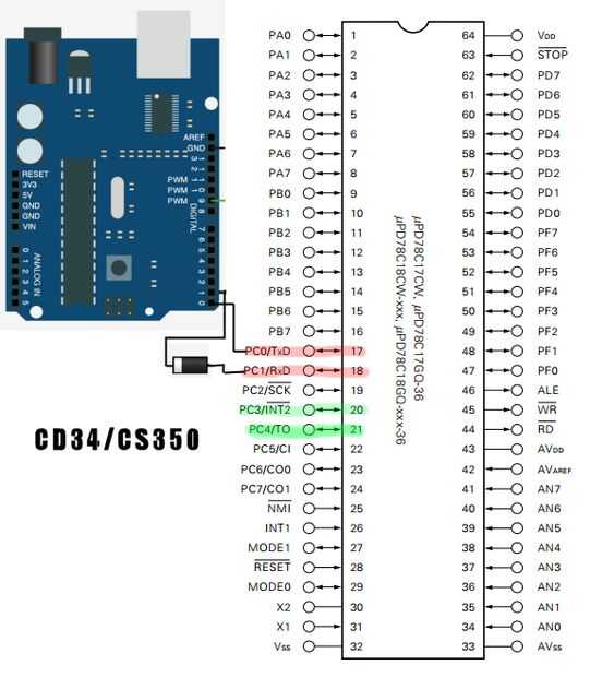 Algunos paneles más adelante (ej. algunos CS350) utiliza un chip de montaje superficial (el chip es muy pequeño y cuadrado). Para éstos, el circuito anterior puede ser mejor - pero si usted desea probar puede ser posible soldar a otro lugar a lo largo de la pista que lleva desde el microchip. Si ven el pinout de la viruta del PD78C17GF en su hoja de datos - son los nombres de pines para conectarse son "PC0/TXD" y "PC1/RXD".