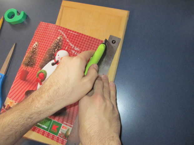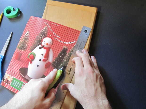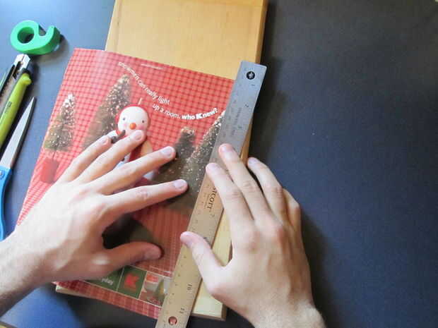 Una vez has medir la primera tira, coincidir la regla con sus marcas. Luego tomar su afilada hoja de elección (el mío es una maquinilla de afeitar porque lamentablemente no tengo un cuchillo x-acto) y cortar la primera tira siguiendo el borde recto de la regla. Encontré que ejerciendo una ligera presión en la cuchilla hace un corte limpio. Al utilizar demasiada presión, la banda terminó arrugándose e irregulares.