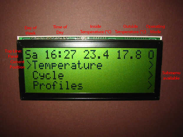 La pantalla LCD muestra una línea de panel de cabecera (información de estado, tiempo, temperatura, funcionamiento modo y caldera del estado) así como 3 líneas de menú. Dependiendo del tamaño de la pantalla, esto puede ser más o menos (por ejemplo encabezado más 1 línea para una pequeña 16 x 2 pantalla). Navegación del menú no afecta al panel de encabezado. Puede verse la actual posición del menú de la izquierda más de lado y es indicado por un ' >'. El texto de la entrada del menú se ve en el centro de la pantalla. En caso de que existen submenús para una entrada de menú, un ' >' se muestra en el lado de la derecha. Elementos del menú se seleccionan pulsando la tecla enter, arriba y abajo se desplaza proporcionalmente dentro del árbol de menú. Presionar entrar para vueltas más a la raíz del menú, presionando hacia 'arriba' ya navega por un menú nivel.