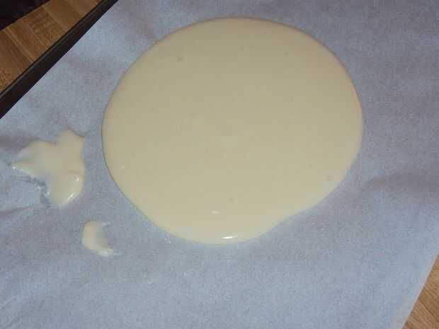 Añadir la vainilla y la mezcla seca y mezclar hasta combinar bien. Verter sobre una sartén media hoja forrada con papel pergamino. Enfríe durante 10 a 15 minutos. Cuando la mezcla esté lo suficientemente fría como para trabajar con, debe dejar que se pega el papel de pergamino. Si está aún pegajosa después de 15 minutos o menos, poner en la nevera por un rato. Una cocina fría es una gran ayuda para este proyecto.