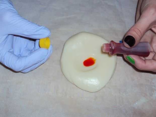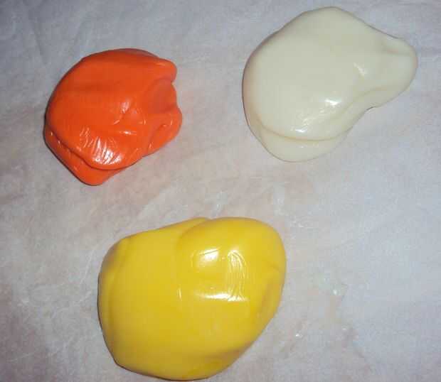 Agregar alimento amarillo colorante a uno y el naranja hasta el último. Llevaba un guante de este ayuda a mantener tus manos de ser manchado. Además, trabajo de amarillo a naranja evita el amarillo siendo contaminado por residuos de naranja que pueden persistir en sus manos.